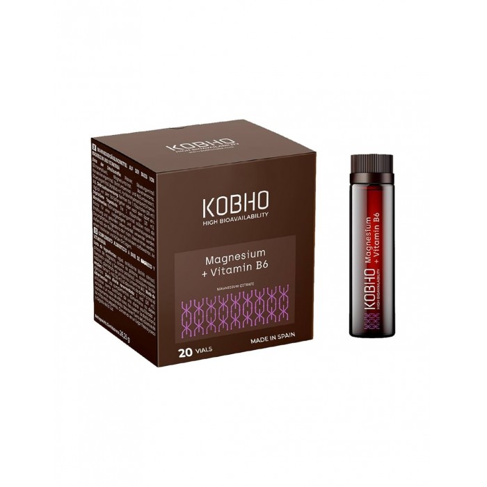 KOBHO Magnesio + Vitamina B6 es un suplemento alimenticio en formato de viales, diseñado para apoyar el correcto funcionamiento del sistema nervioso y muscular.